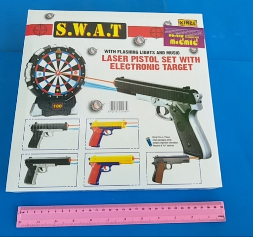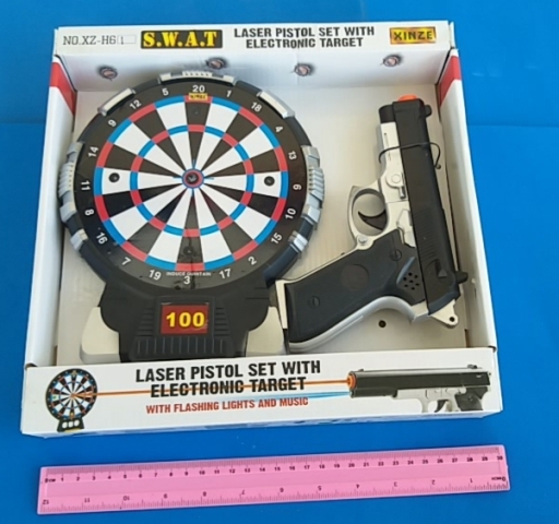 אקדח לייזר | אקדח לייזר עם לוח קליעה, מוצר איכותי,עם לוח קליעה אלקטרוני עובד על סוללות, מגיע בשלל צבעים ודוגמאות, בחירת הצבע והדוגמה נעשית באופן אקראי, משחק מהנה, מתאים למתנות לימי הולדת, פרסים מיוחדים, מסיבות ימי הולדת ופרסים לתחרויות, מגיע ללא 4 סוללות AA שניתן לרכוש באתר בנפרד, סרגל מוצמד למוצר להמחשת הגודל, מחיר ליחידה אחת, המחירים המוצגים באתר הם מחירי סיטונאות והמחיר המוצג הוא מחיר לפני מע"מ. מומלץ לילדים מעל גיל 3, ניתן לראות עוד מוצרים באתר בקישור : צעצועים בסיטונאות