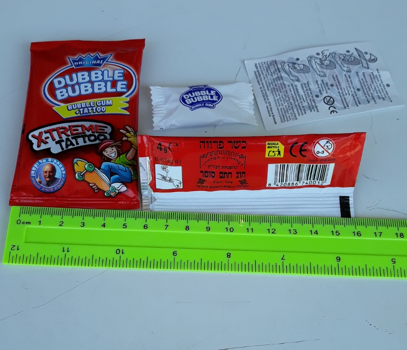 מסטיק עם קעקוע, מתאים לימי הולדת, בר מתוקים, מתאים למילוי פניאטה שניתן להזמין באתר, כל הממתקים המופיעים באתר הם עם כשרות המצוינת על גבי האריזה, המוצר מופיע בקטגוריה ממתקים, המחירים סיטונאים והמחיר שמוצג באתר הוא ללא מע"מ, ניתן לראות עוד מוצרים באתר בקישור : ממתקים בסיטונאות