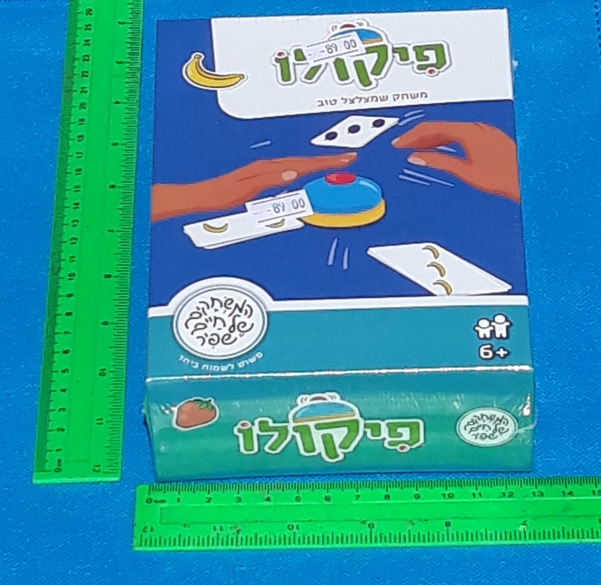 משחק פיקולו | פיקולו משחק קופסא, קלפי המשחק נושאים ציורים של ארבעה סוגי פירות בכמות של אחד עד חמישה. כל שחקן מתחיל עם חפיסת קלפים סגורה, ובתורו פותח את הקלף העליון ומניח אותו לפניו. ממשיכים לפתוח קלפים עד אשר סכום אחד הפירות הוא חמישה בדיוק. ברגע זה ממהרים כולם לצלצל בפעמון, והזריז ביותר זוכה בכל הקלפים הפתוחים. לעולם אין לדעת מתי תופיע החמישייה כך שלפעמים השלל זעום ולפעמים הוא עצום… מי שמאבד את כל קלפיו יוצא מהמשחק, ומי שמחזיק בסוף המשחק כמות הקלפים הגדולה ביותר הוא המנצח. בפנים מחכים לכם: 55 קלפים, פעמון קריאה והוראות המשחק, מוצר איכותי, לכל גיל, מגיע בשלל צבעים ודוגמאות, בחירת הצבע והדוגמא נעשית באופן אקראי, מתאים להפתעות לימי הולדת, פרסים מיוחדים, מסיבות ימי הולדת ופרסים לתחרויות, סרגל מוצמד למוצר להמחשת הגודל, מחיר ליחידה אחת, המחירים המוצגים באתר הם מחירי סיטונאות והמחיר המוצג הוא מחיר לפני מע"מ. ניתן לראות עוד מוצרים באתר בקישור : צעצועים בסיטונאות