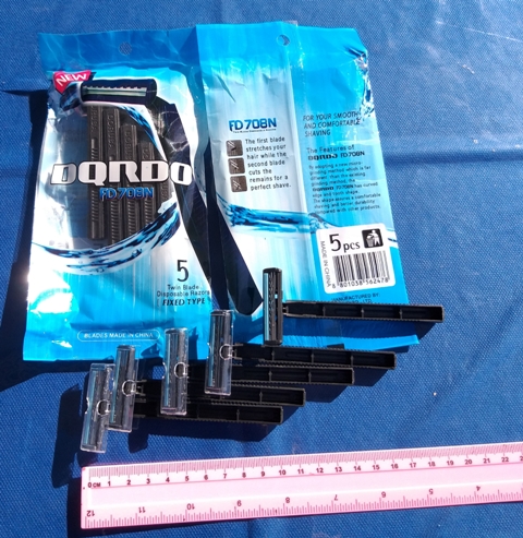 סכין גילוח | להב כפול מארז חמישייה כחול,  מאוד איכותי, עם פס החלקה, מגיע במבחר צבעים ודוגמאות, בחירת הצבע והדגם נעשית באופן אקראי, סרגל מוצמד למוצר להמחשת הגודל, מחיר למארז 5 סכינים, המחירים המוצגים באתר הם מחירי סיטונאות והמחיר המוצג הוא מחיר לפני מע"מ. ניתן לראות עוד מוצרים באתר בקישור : אביזרי אופנה