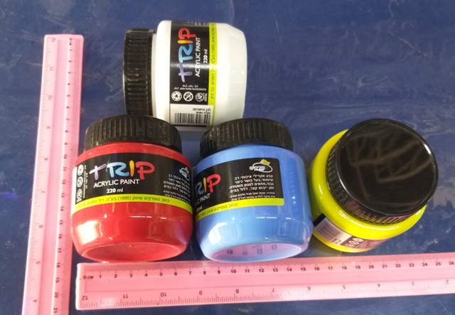 צבעים אקריליים | צבעי אקריליק 220 מל | צבע אקרילי TRIP, צבעים חזקים, כיסוי גבוה, יבוש מהיר, איכותיים ובטוחים של חברת TRIP, מתאימים למשטחים עץ, בד, קנבס, לבד, קרטון, דאס, ורהיטים, ללא חומרים משמרים. *עומדת בתקני איכות מתמידיים. מוצר איכותי, לכל גיל, מגיע בשלל צבעים ודוגמאות, בחירת הצבע והדוגמה נעשית באתר, סרגל מוצמד למוצר להמחשת הגודל, מחיר ליחידה אחת, מומלץ לילדים מעל גיל 3, המחירים המוצגים באתר הם מחירי סיטונאות והמחיר המוצג הוא מחיר לפני מע"מ. ניתן לראות עוד מוצרים דומים בקישור: יצירה וחומרי יצירה