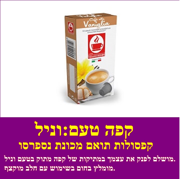 קפסולות תואמת נספרסו טעם וניל, של המותג האיטלקי קפה BONINI הידוע בתערובות הקפה הטובות בעולם שמככבות ברוב בתי הנסיכויות בעולם, דרגת חוזק בינונית, מושלם לפינוק עצמי, במתיקות של קפה מתוק בטעם וניל, מומלץ בשימוש עם חלב מוקצף, מתאים לרוב מכונות נספרסו, במחירי היבואן ובמחיר סיטונאי, המחירים המוצגים באתר הם ללא מע"מ וללא משלוח, ניתן לראות עוד דוגמאות באתר בקישור : קפסולות נספרסו